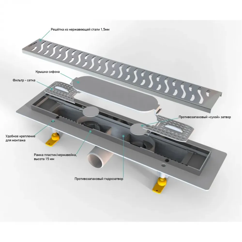 Комбинированный затвор (сухой + гидрозатвор) не пропускает запахи в помещение, надежно защищая вас от неприятных сюрпризов. Такая конструкция сифона в душевом лотке считается самой универсальной и надежной защитой от запахов и бактерий. Сифоны такой конструкции отличает двухуровневая защита: водяная пробка не пропускает запахи при постоянной эксплуатации, а воздушная поплавковая система является дополнительной преградой, при пересыхании водяной пробки.