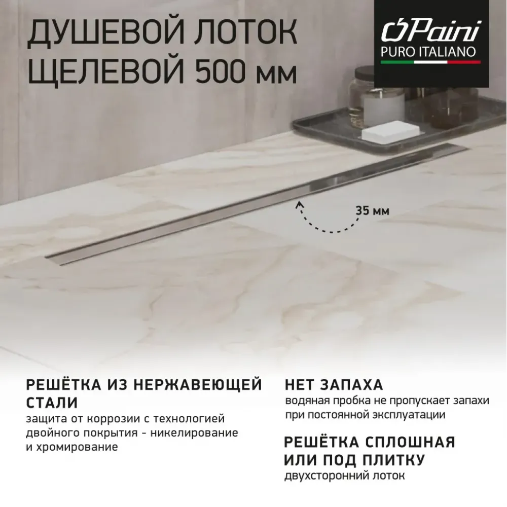 Лоток PAINI можно положить ровной стороной, а можно перевернуть и уложить на него плитку. Так получится максимально замаскировать слив воды.
