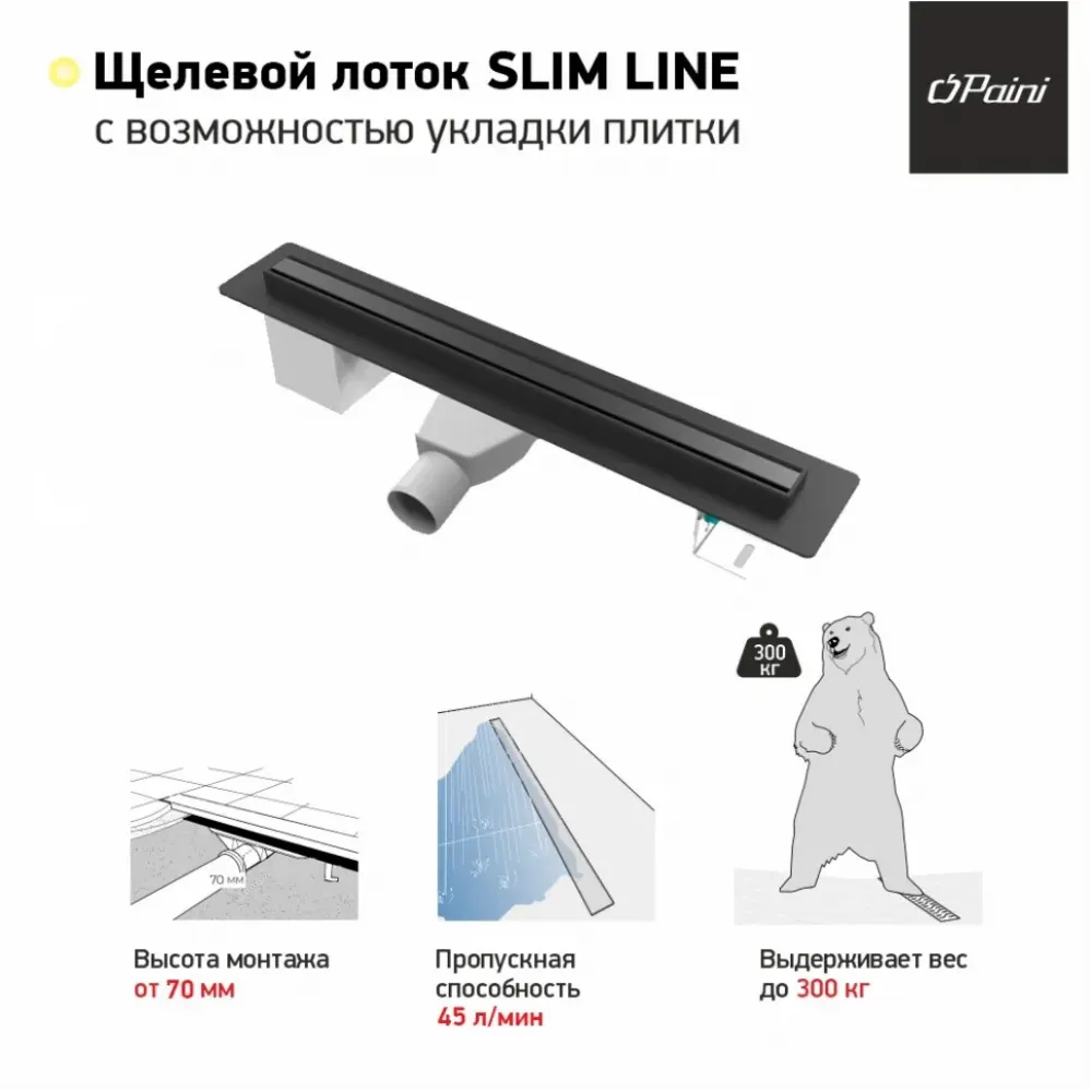 Лоток PAINI можно положить ровной стороной, а можно перевернуть и уложить на него плитку. Так получится максимально замаскировать слив воды.