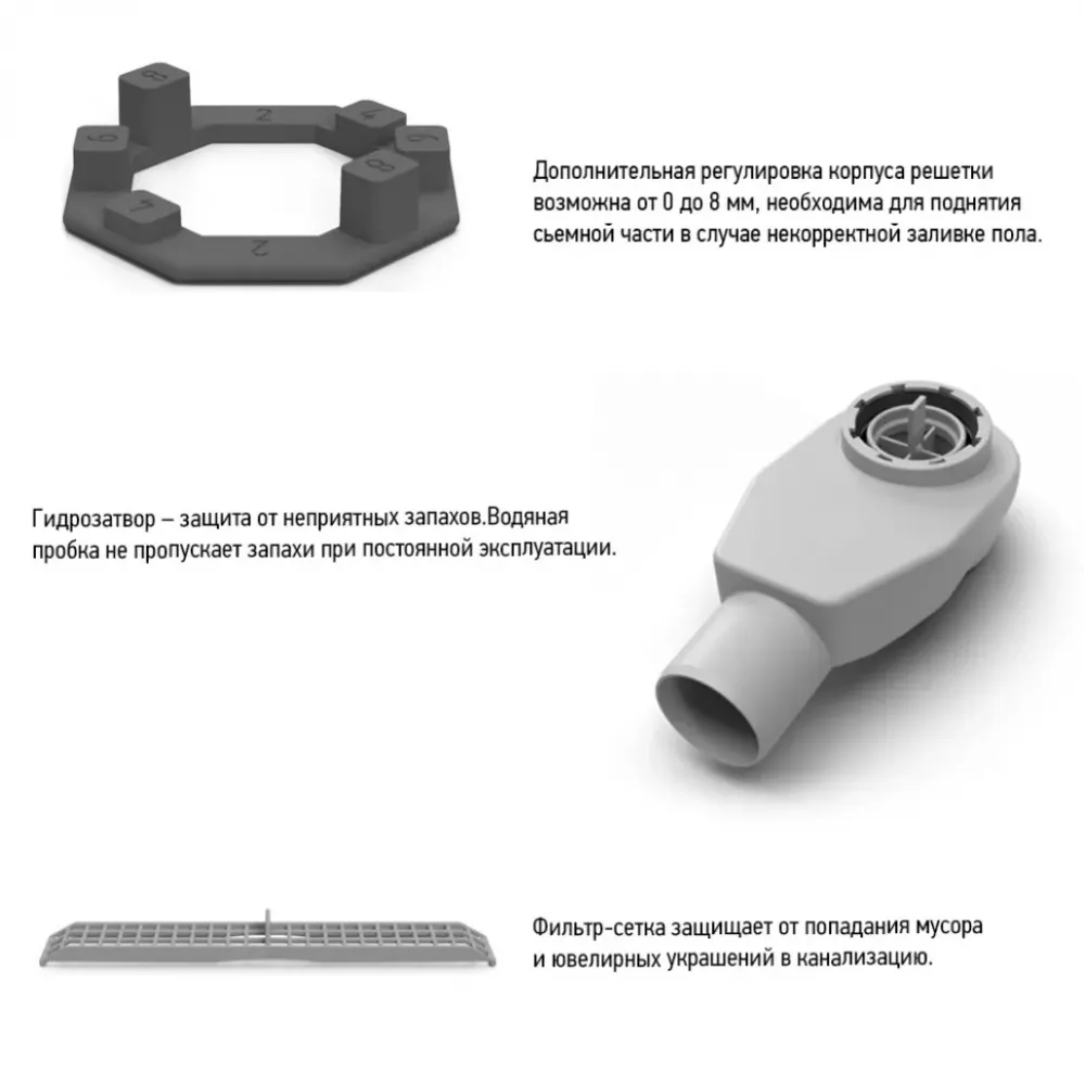 Можно установить как на регулируемые ножки, так и на подставку из полистирола (входит в комплект). Поворотный на 360 градусов сифон – удобно подключить к коммуникациям, даже если установка труб выполнена с небольшими ошибками. Заливка пола при установке – от 70 мм.