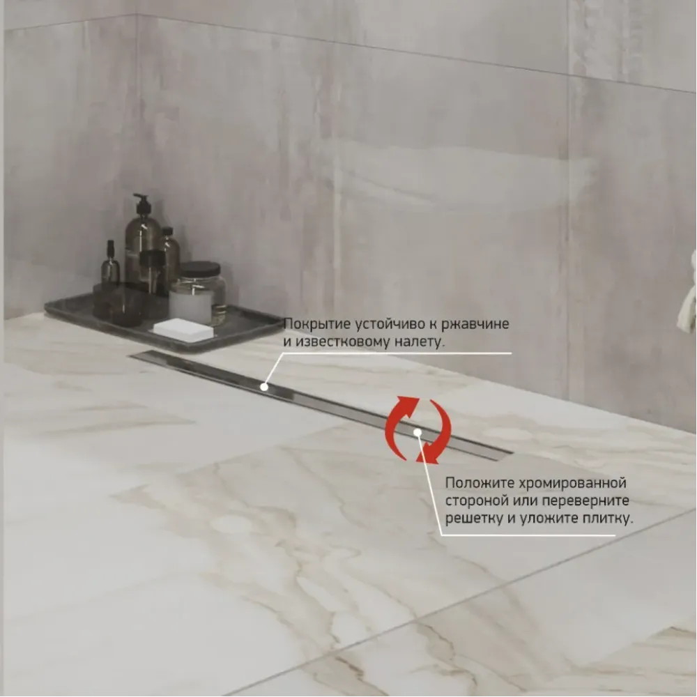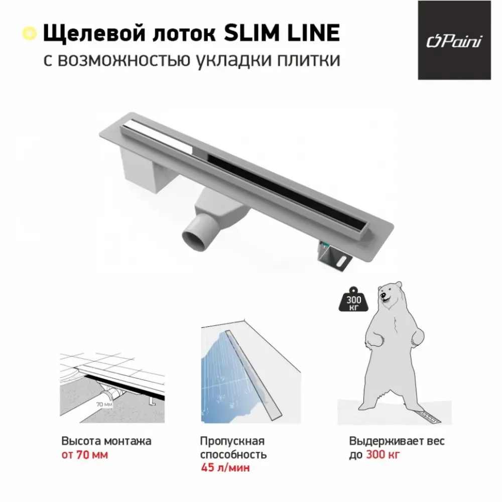 Лоток PAINI можно положить ровной стороной, а можно перевернуть и уложить на него плитку. Так получится максимально замаскировать слив воды.