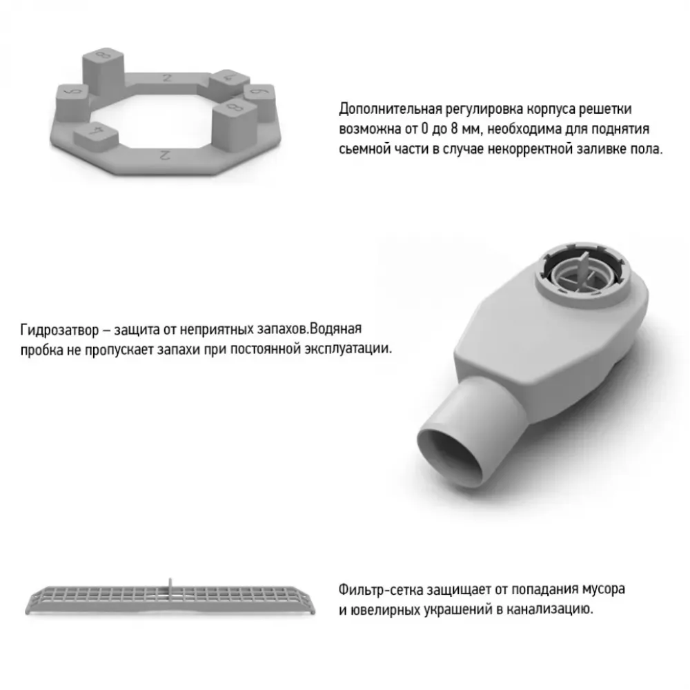 Можно установить как на регулируемые ножки, так и на подставку из полистирола (входит в комплект). Поворотный на 360 градусов сифон – удобно подключить к коммуникациям, даже если установка труб выполнена с небольшими ошибками. Заливка пола при установке – от 70 мм.