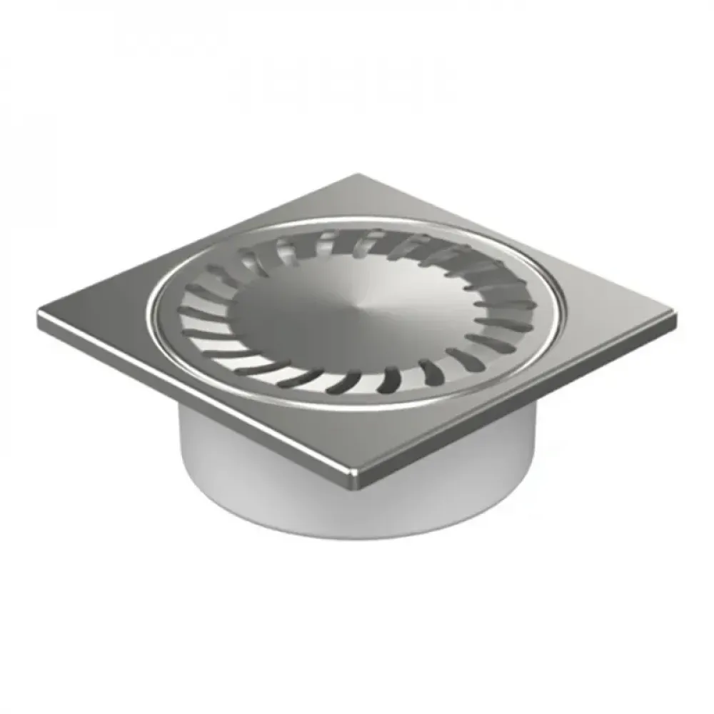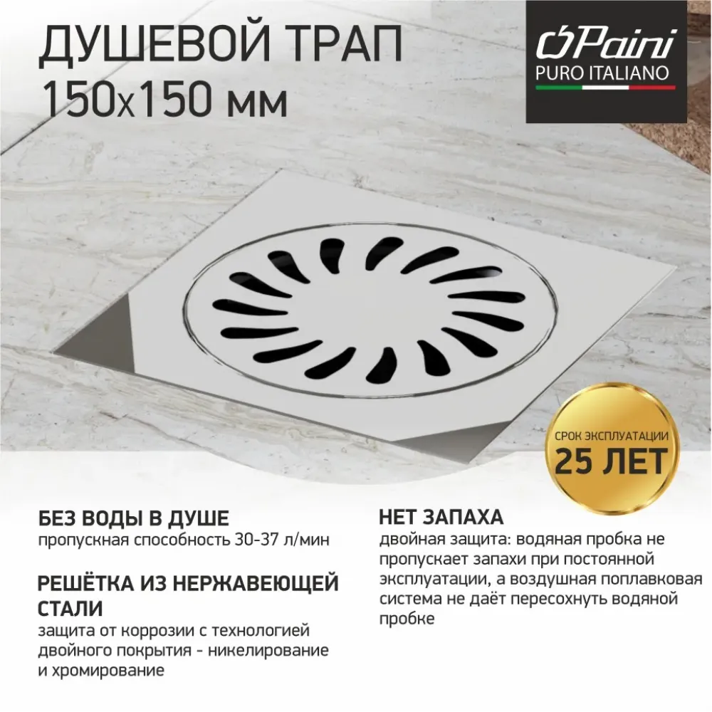 Душевой трап с рисунком на решетке SUN PAINI позволяет создать безбарьерную среду в санузле. Несмотря на вертикальный выпуск, конструкция дает возможность осуществить установку в стяжку от 105 мм. Размер трапа – всего 150х150 мм.