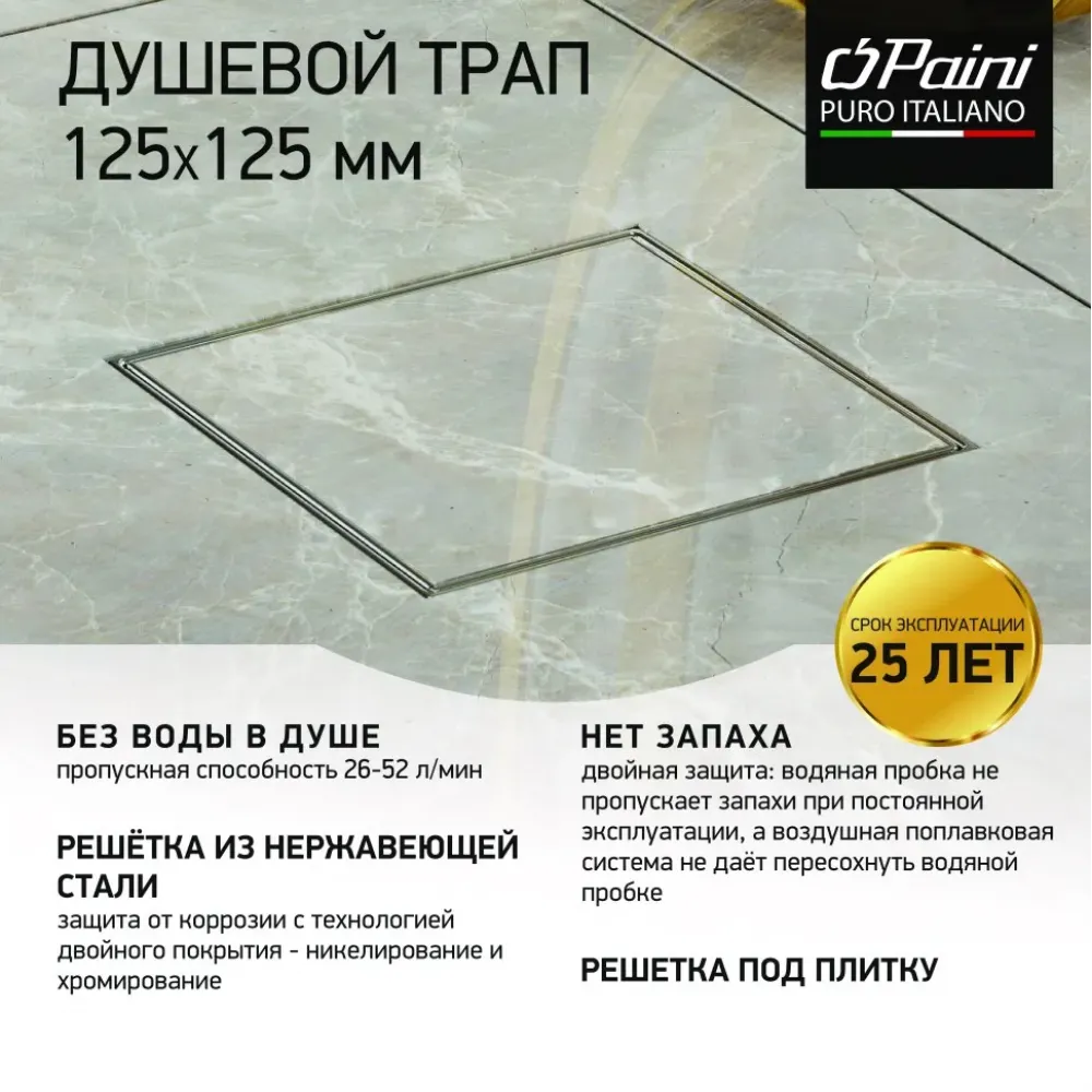 Душевой трап с решеткой под плитку PAINI позволяет создать безбарьерную среду в санузле. Горизонтальный выпуск позволяет осуществить установку в стяжку от 82 мм. Размер трапа – всего 125x125 мм. Благодаря тому, что плитка устанавливается в решетку, конструкция трапа практически незаметна на полу. Рисунок пола сохраняется единым.