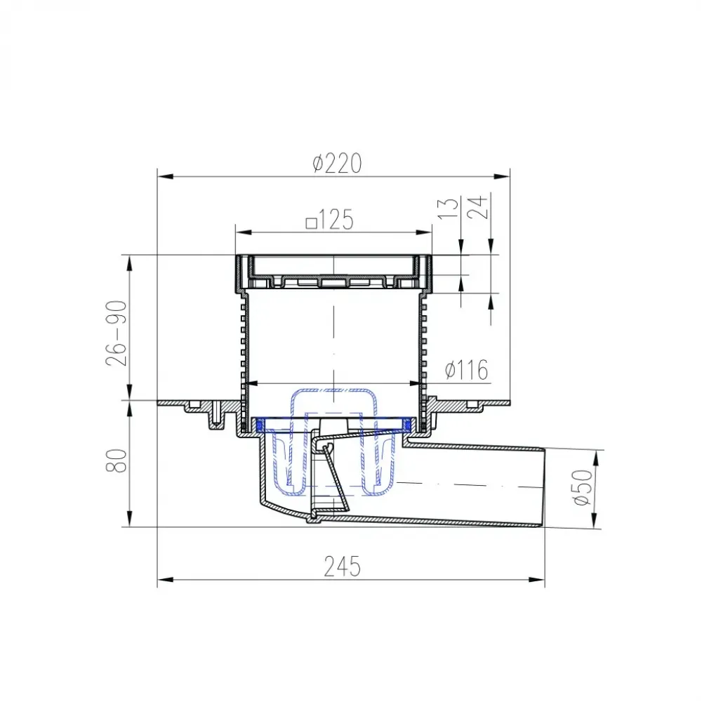 Душевой трап с решеткой под плитку PAINI позволяет создать безбарьерную среду в санузле. Благодаря тому, что плитка устанавливается в решетку, конструкция трапа практически незаметна на полу. Рисунок пола сохраняется единым. Горизонтальный выпуск позволяет осуществить установку в стяжку от 82 мм. Компактный размер трапа – всего 125x125 мм.