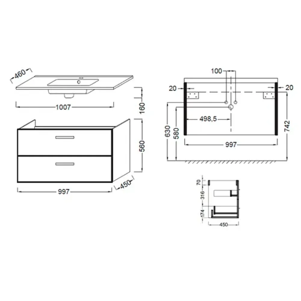 Технические характеристики Комплект мебели для ванной Ola 100 см, серый антрацит, с 2 ящиками, подвесной монтаж EXU112-00+EB1099-RU+EB392-N14 Jacob Delafon