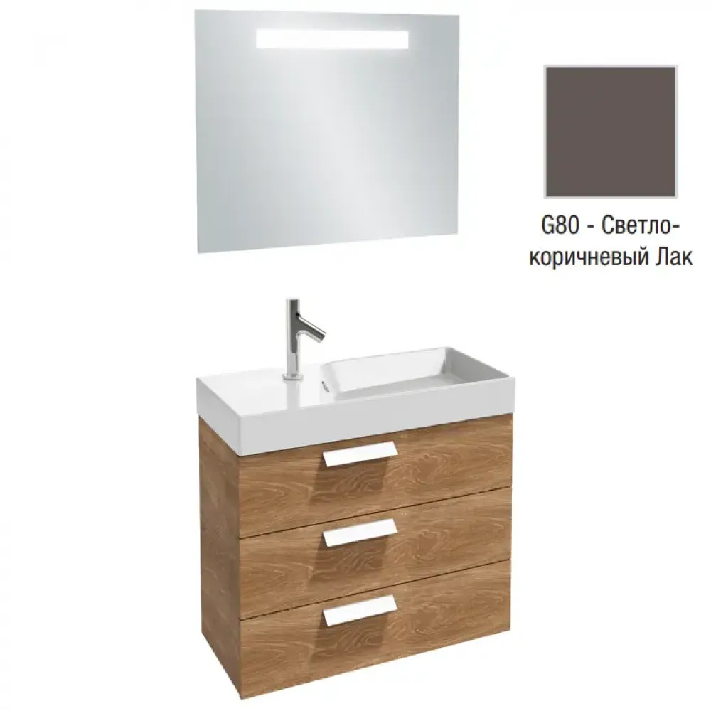 Комплект мебели для ванной Rythmik 80 см, светло-коричневый блестящий лак, 3 основных ящика, полотно, левая раковина, с подсветкой, подвесной монтаж EB1160-NF+EXP112-Z-00+EB1308-G80 Jacob Delafon