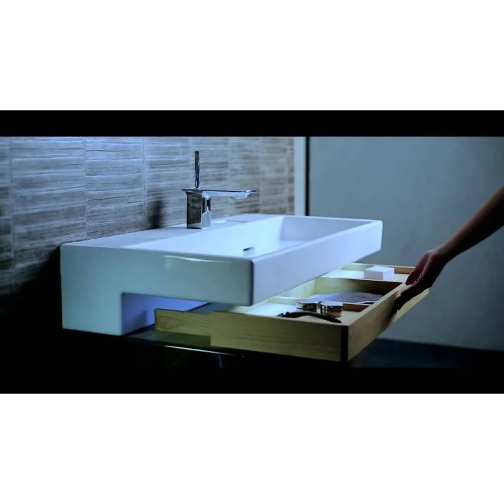 Уникальная L-образная раковина представляет собой функциональный элемент дизайна. Раковина подвесная, но может также быть установлена на мебель или столешницу.
