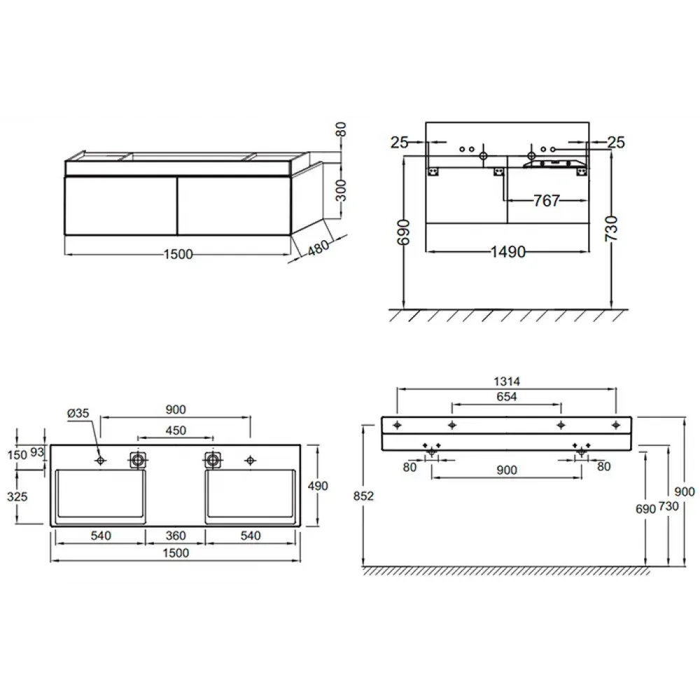 Terrace 150см, комплект мебели для ванной, подвесной, белый, двойная раковина с подсветкой,Jacob Delafon, Франция