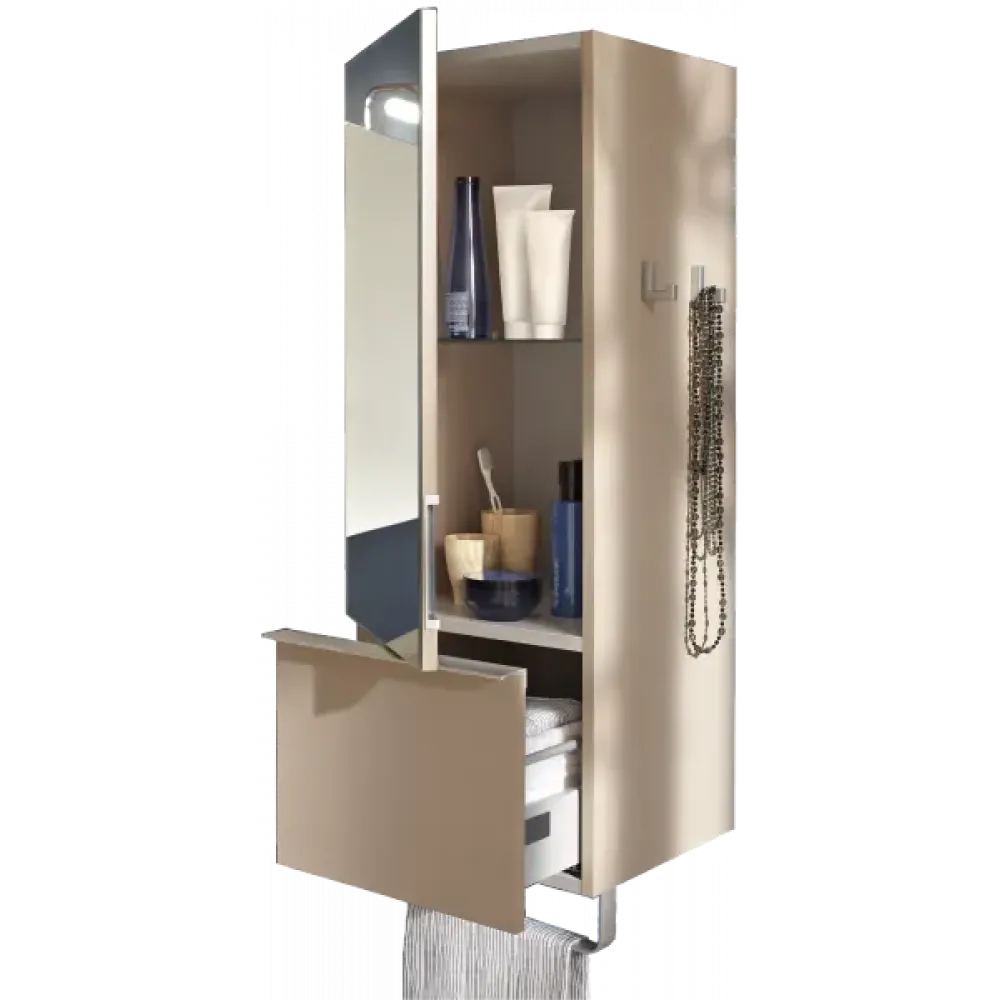 Одна дверца зеркальная, один выдвижной ящик с механизмом «плавное закрывание», две стеклянные полки, 2 крючка, полотенцедержатель.