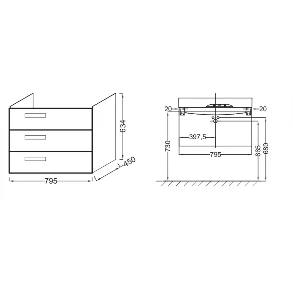Технические характеристики Модуль под раковину Rythmik 79,5х45х63,4 см, белый глянцевый, 3 выдвижных ящика EB1309-HU Jacob Delafon