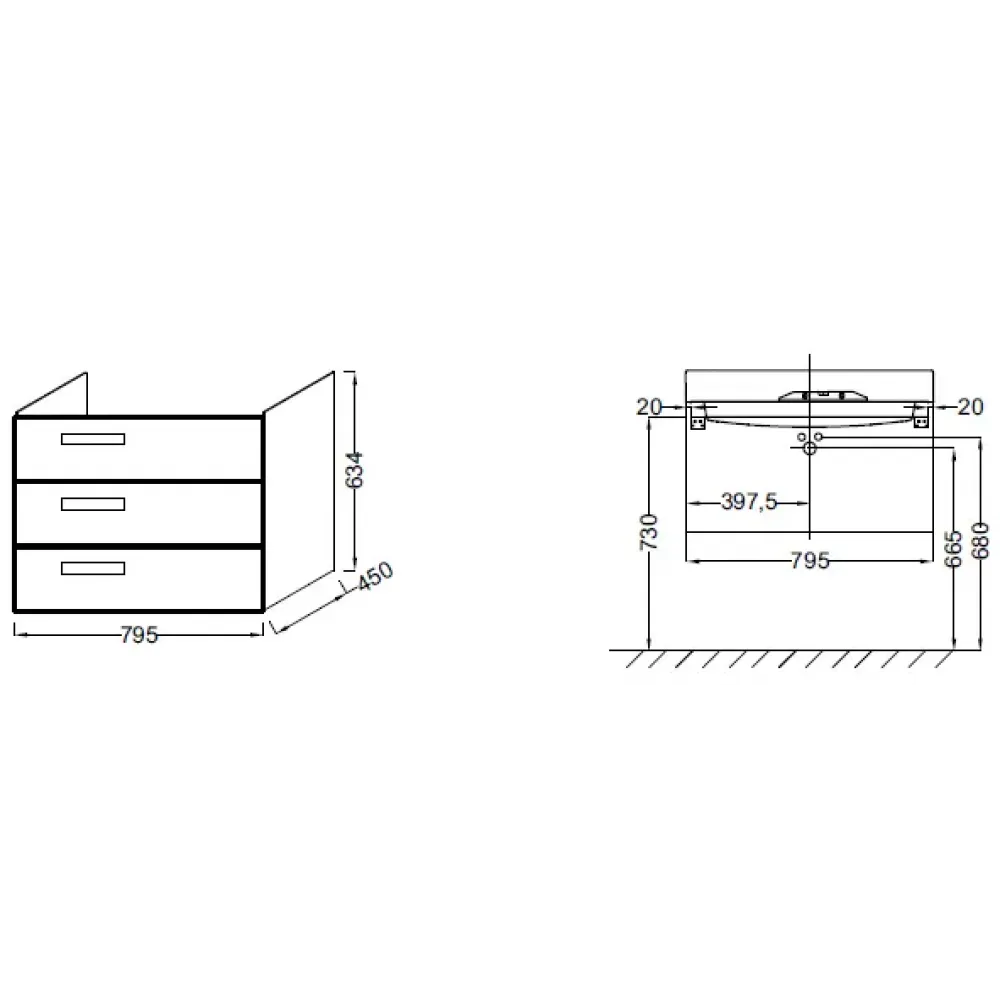 Технические характеристики Модуль под раковину Rythmik 79,5х45х63,4 см, серая кожа, 3 выдвижных ящика EB1309-N29 Jacob Delafon
