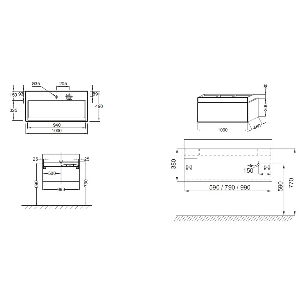Технические характеристики Модуль под раковину Terrace 100х48х30 см, 2 розетки, белый глянцевый, верхний ящик из цельного дерева, система push-to-open EB1732RU-G1C Jacob Delafon