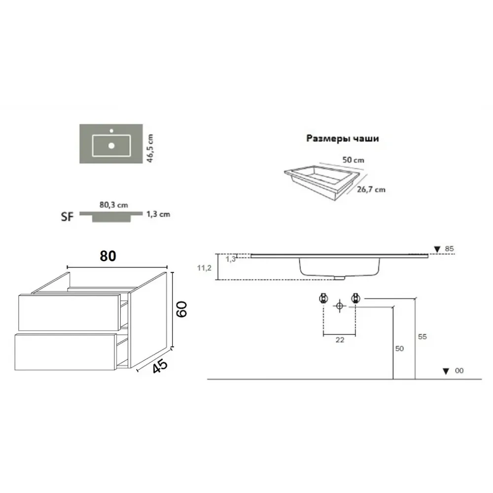 Ширина тумбы: 80 см. Ширина раковины: 60 см.