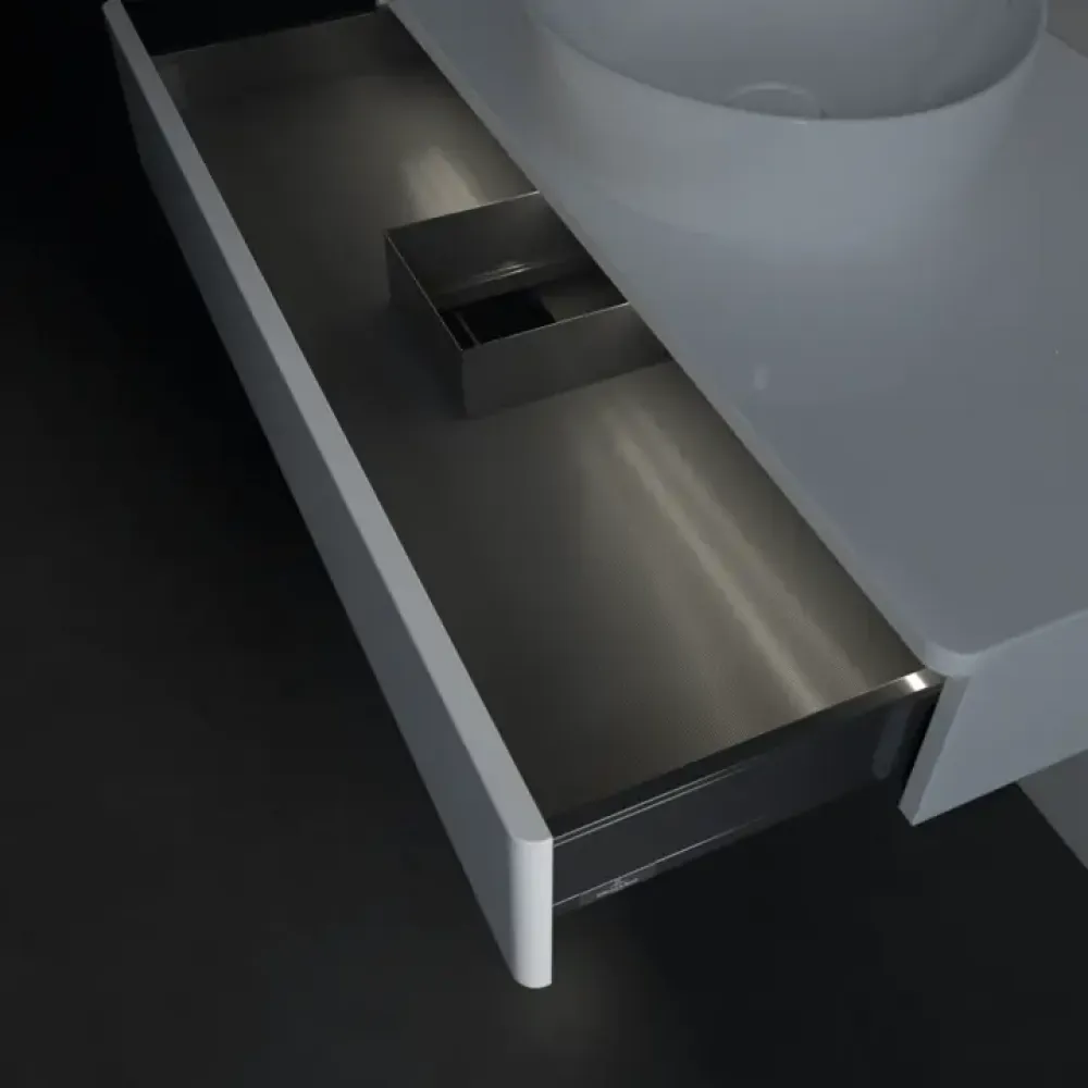 Благодаря функции полного выдвижения выдвижные ящики можно полностью выдвигать. Все их содержимое хорошо видно и его удобно доставать. Больше не нужно копаться в дальних отсеках выдвижного ящика — благодаря мебели для ванной с полным выдвижением вы получаете полный обзор.