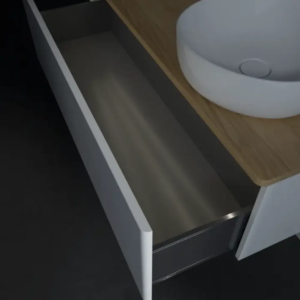 Благодаря функции полного выдвижения выдвижные ящики можно полностью выдвигать. Все их содержимое хорошо видно и его удобно доставать. Больше не нужно копаться в дальних отсеках выдвижного ящика — благодаря мебели для ванной с полным выдвижением вы получаете полный обзор.