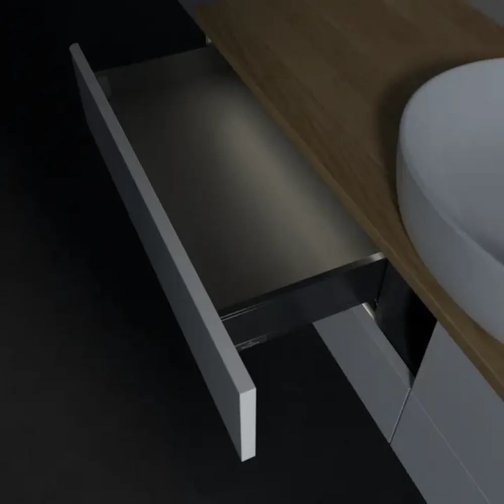 Благодаря функции полного выдвижения выдвижные ящики можно полностью выдвигать. Все их содержимое хорошо видно и его удобно доставать. Больше не нужно копаться в дальних отсеках выдвижного ящика — благодаря мебели для ванной с полным выдвижением вы получаете полный обзор.