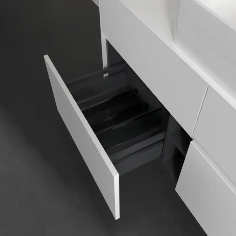 Продуманное внутреннее разделение мебели для ванной Villeroy & Boch позволяет создать индивидуальную систему организации пространства в ванной комнате. Элементы, расположение которых можно менять, например регулируемые стеклянные перегородки и контейнеры для аксессуаров различных размеров, обеспечивают хороший обзор и порядок. Благодаря практичной системе внутреннего разделения вы будете быстро находить принадлежности для ванной, которыми вы постоянно пользуетесь.
