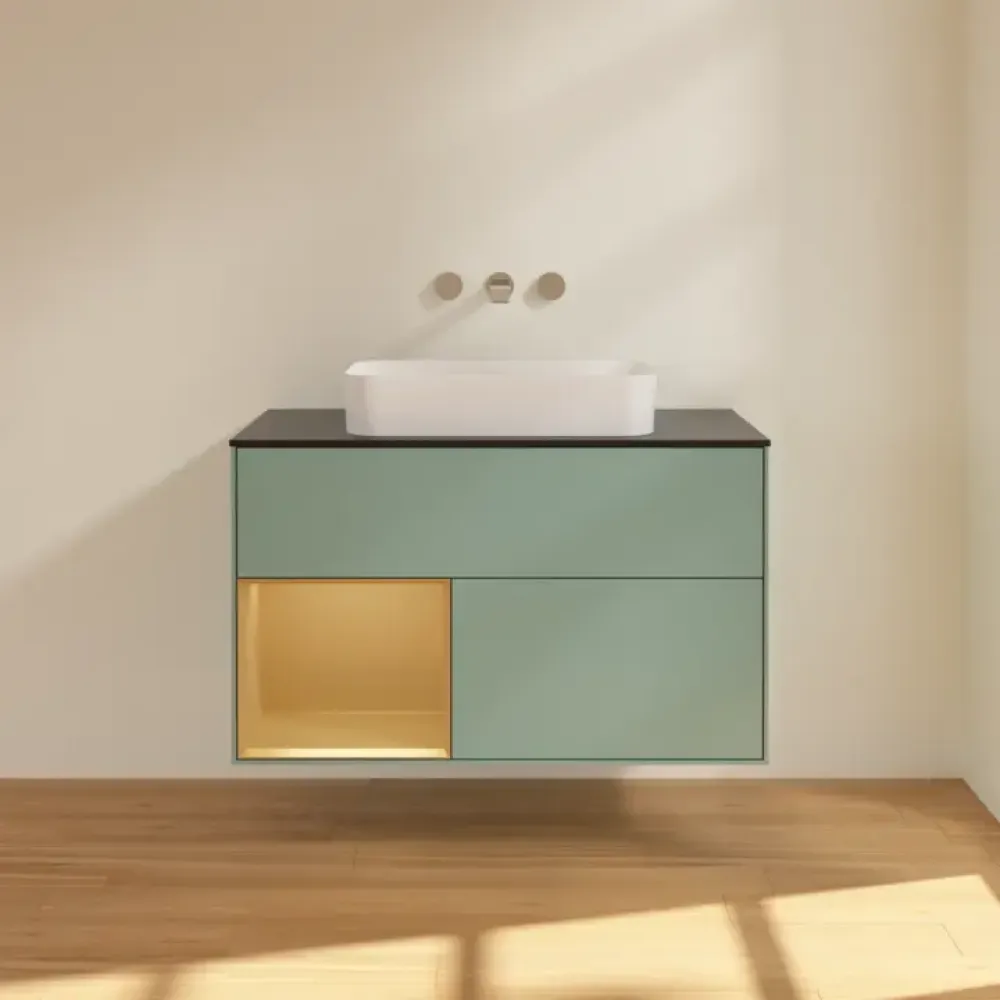 Villeroy & Boch Finion Тумба под раковину, с подсветкой, 2 выдвижных ящика, 1000 x 603 x 501 mm, Olive Matt Lacquer / Gold Matt Lacquer F652HFGM