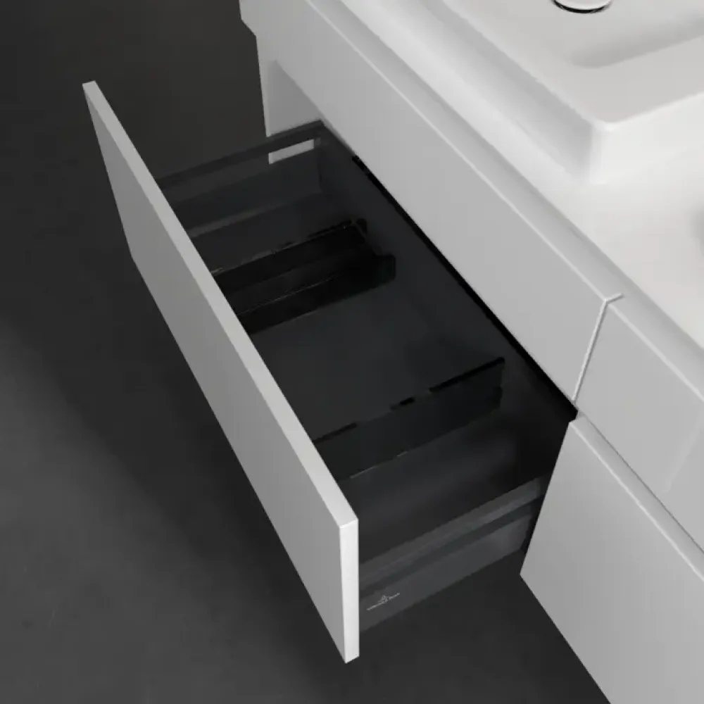 Продуманное внутреннее разделение мебели для ванной Villeroy & Boch позволяет создать индивидуальную систему организации пространства в ванной комнате. Элементы, расположение которых можно менять, например регулируемые стеклянные перегородки и контейнеры для аксессуаров различных размеров, обеспечивают хороший обзор и порядок. Благодаря практичной системе внутреннего разделения вы будете быстро находить принадлежности для ванной, которыми вы постоянно пользуетесь.