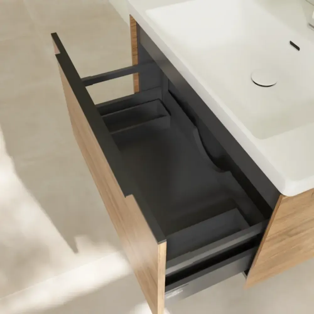Благодаря функции полного выдвижения выдвижные ящики можно полностью выдвигать. Все их содержимое хорошо видно и его удобно доставать. Больше не нужно копаться в дальних отсеках выдвижного ящика — благодаря мебели для ванной с полным выдвижением вы получаете полный обзор.