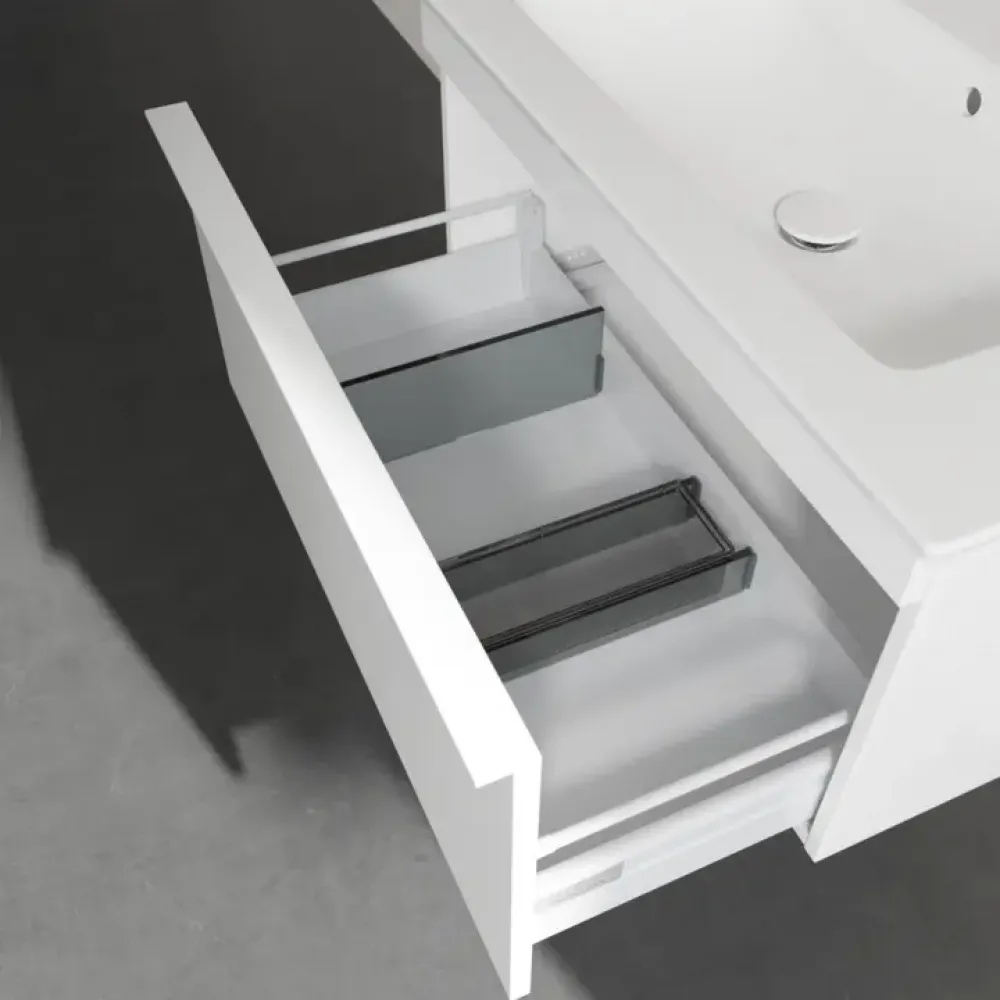 Продуманное внутреннее разделение мебели для ванной Villeroy & Boch позволяет создать индивидуальную систему организации пространства в ванной комнате. Элементы, расположение которых можно менять, например регулируемые стеклянные перегородки и контейнеры для аксессуаров различных размеров, обеспечивают хороший обзор и порядок. Благодаря практичной системе внутреннего разделения вы будете быстро находить принадлежности для ванной, которыми вы постоянно пользуетесь.