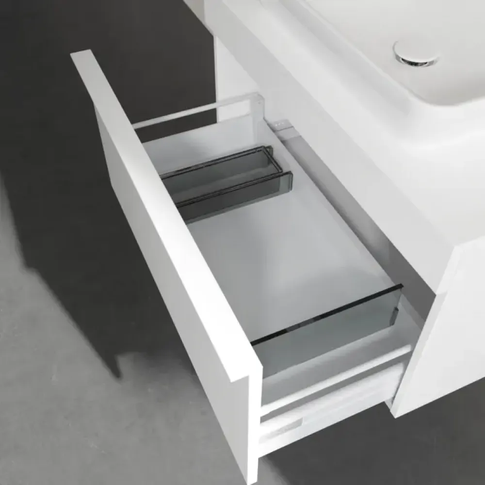 Продуманное внутреннее разделение мебели для ванной Villeroy & Boch позволяет создать индивидуальную систему организации пространства в ванной комнате. Элементы, расположение которых можно менять, например регулируемые стеклянные перегородки и контейнеры для аксессуаров различных размеров, обеспечивают хороший обзор и порядок. Благодаря практичной системе внутреннего разделения вы будете быстро находить принадлежности для ванной, которыми вы постоянно пользуетесь.