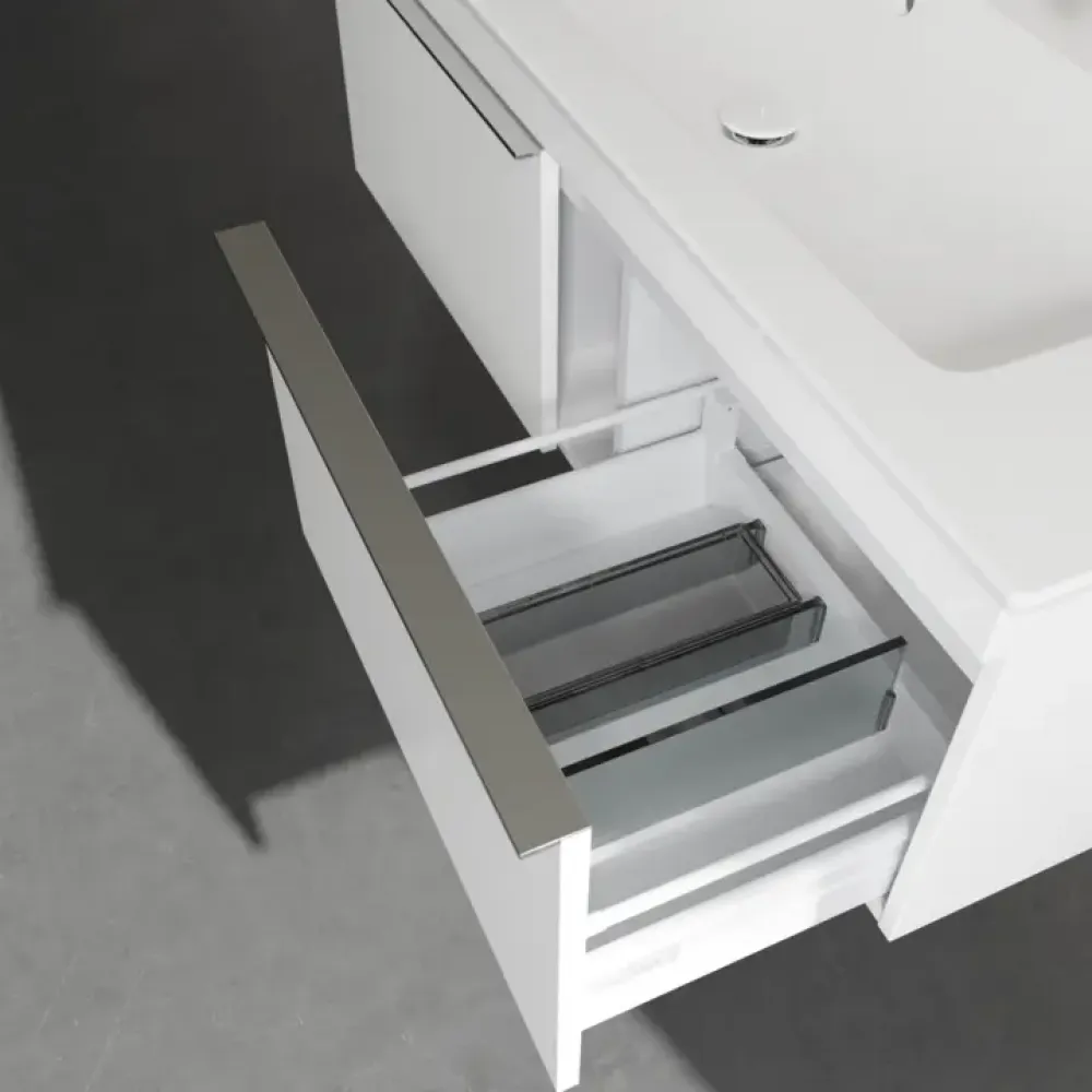 Продуманное внутреннее разделение мебели для ванной Villeroy & Boch позволяет создать индивидуальную систему организации пространства в ванной комнате. Элементы, расположение которых можно менять, например регулируемые стеклянные перегородки и контейнеры для аксессуаров различных размеров, обеспечивают хороший обзор и порядок. Благодаря практичной системе внутреннего разделения вы будете быстро находить принадлежности для ванной, которыми вы постоянно пользуетесь.