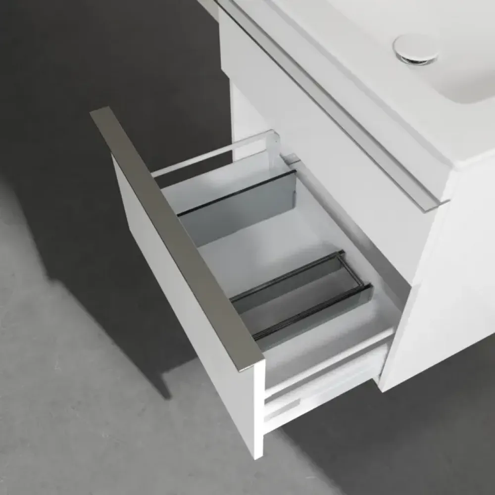 Продуманное внутреннее разделение мебели для ванной Villeroy & Boch позволяет создать индивидуальную систему организации пространства в ванной комнате. Элементы, расположение которых можно менять, например регулируемые стеклянные перегородки и контейнеры для аксессуаров различных размеров, обеспечивают хороший обзор и порядок. Благодаря практичной системе внутреннего разделения вы будете быстро находить принадлежности для ванной, которыми вы постоянно пользуетесь.