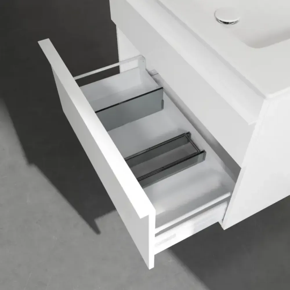 Продуманное внутреннее разделение мебели для ванной Villeroy & Boch позволяет создать индивидуальную систему организации пространства в ванной комнате. Элементы, расположение которых можно менять, например регулируемые стеклянные перегородки и контейнеры для аксессуаров различных размеров, обеспечивают хороший обзор и порядок. Благодаря практичной системе внутреннего разделения вы будете быстро находить принадлежности для ванной, которыми вы постоянно пользуетесь.