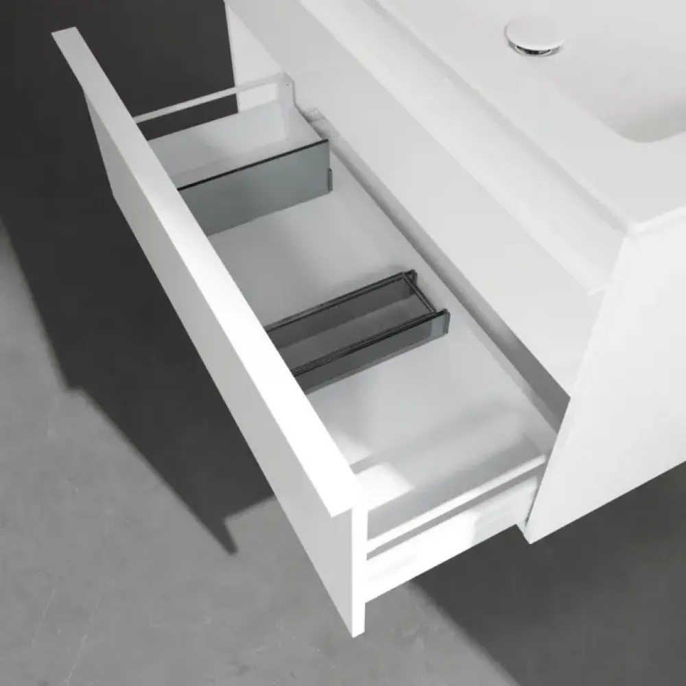 Продуманное внутреннее разделение мебели для ванной Villeroy & Boch позволяет создать индивидуальную систему организации пространства в ванной комнате. Элементы, расположение которых можно менять, например регулируемые стеклянные перегородки и контейнеры для аксессуаров различных размеров, обеспечивают хороший обзор и порядок. Благодаря практичной системе внутреннего разделения вы будете быстро находить принадлежности для ванной, которыми вы постоянно пользуетесь.