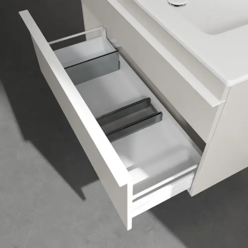 Продуманное внутреннее разделение мебели для ванной Villeroy & Boch позволяет создать индивидуальную систему организации пространства в ванной комнате. Элементы, расположение которых можно менять, например регулируемые стеклянные перегородки и контейнеры для аксессуаров различных размеров, обеспечивают хороший обзор и порядок. Благодаря практичной системе внутреннего разделения вы будете быстро находить принадлежности для ванной, которыми вы постоянно пользуетесь.