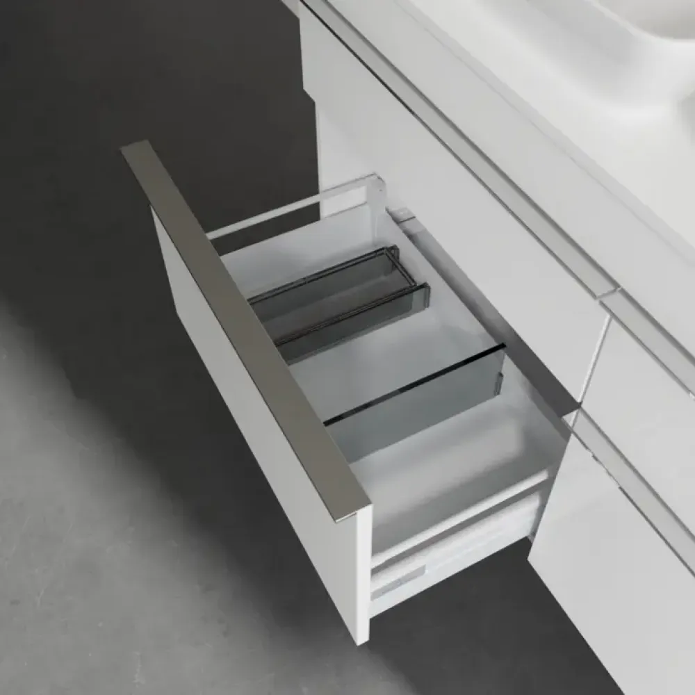 Продуманное внутреннее разделение мебели для ванной Villeroy & Boch позволяет создать индивидуальную систему организации пространства в ванной комнате. Элементы, расположение которых можно менять, например регулируемые стеклянные перегородки и контейнеры для аксессуаров различных размеров, обеспечивают хороший обзор и порядок. Благодаря практичной системе внутреннего разделения вы будете быстро находить принадлежности для ванной, которыми вы постоянно пользуетесь.