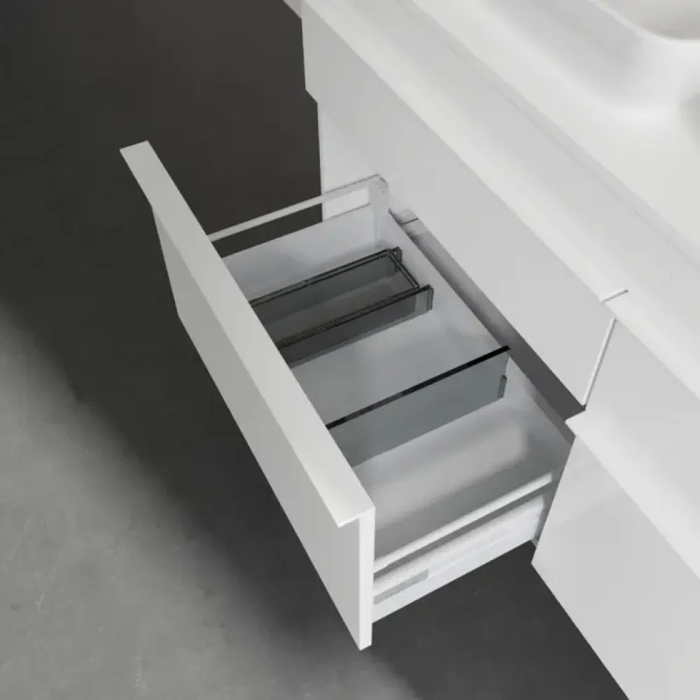 Продуманное внутреннее разделение мебели для ванной Villeroy & Boch позволяет создать индивидуальную систему организации пространства в ванной комнате. Элементы, расположение которых можно менять, например регулируемые стеклянные перегородки и контейнеры для аксессуаров различных размеров, обеспечивают хороший обзор и порядок. Благодаря практичной системе внутреннего разделения вы будете быстро находить принадлежности для ванной, которыми вы постоянно пользуетесь.