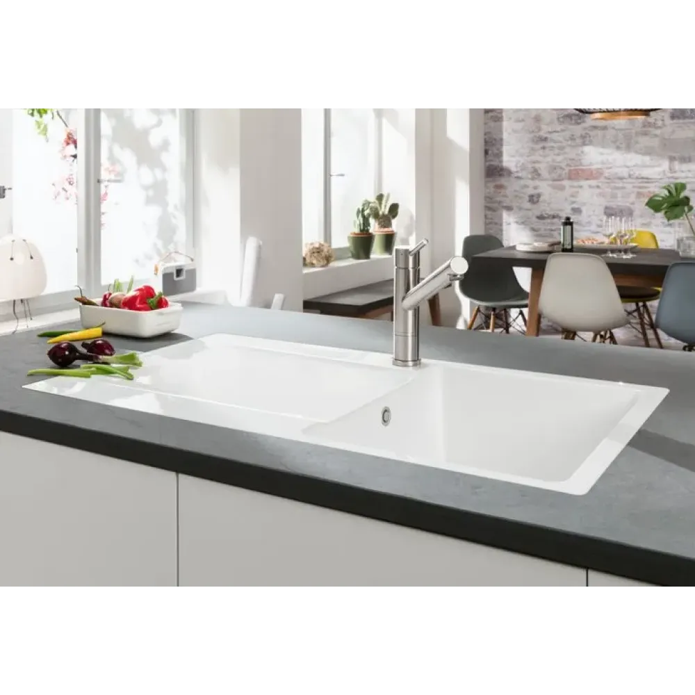 Не имеет значения, ополаскиваете ли вы большие противни, крупногабаритную кухонную утварь или хрупкие стаканы — встроенное крыло керамических моек компании Villeroy & Boch обеспечивает много места для сушки любых предметов, при этом столешница остается сухой.