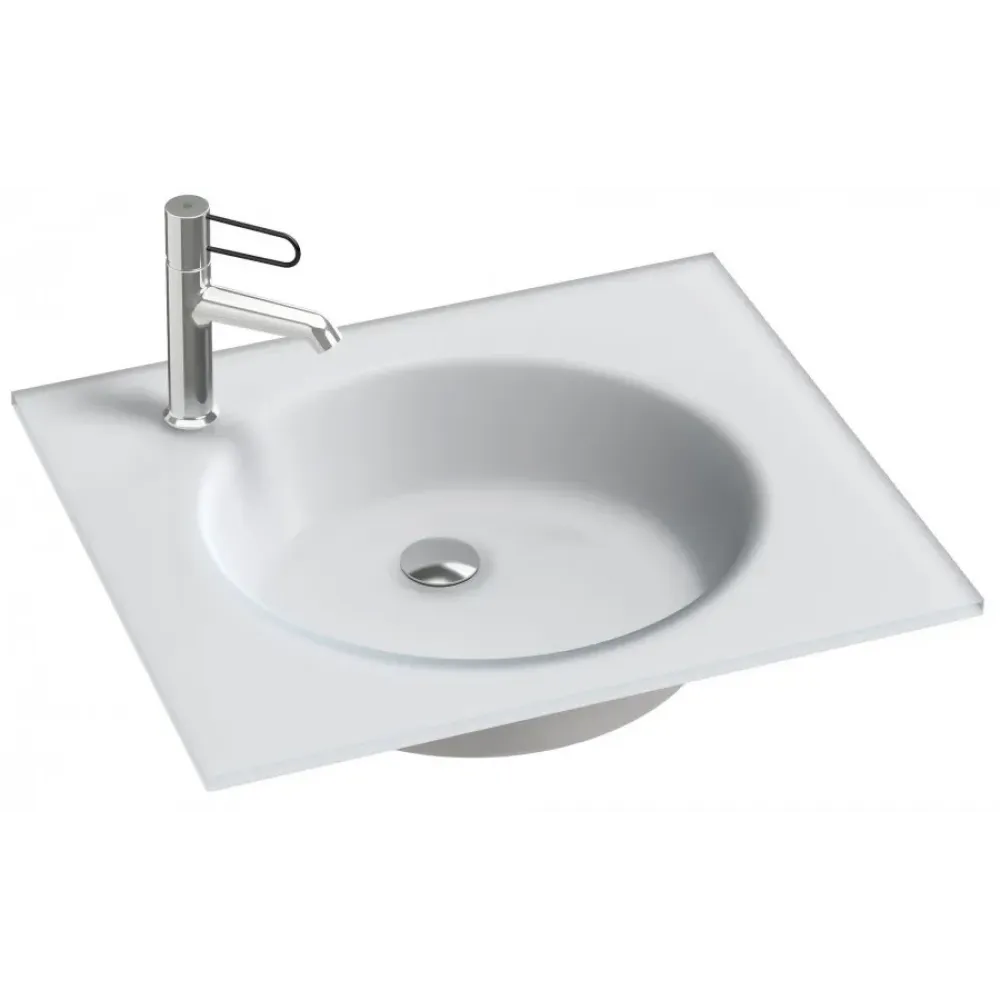 Раковина-столешница из матового стекла, 61 x 51 см, не предназначена для установки без мебели. Одно отверстие для смесителя.