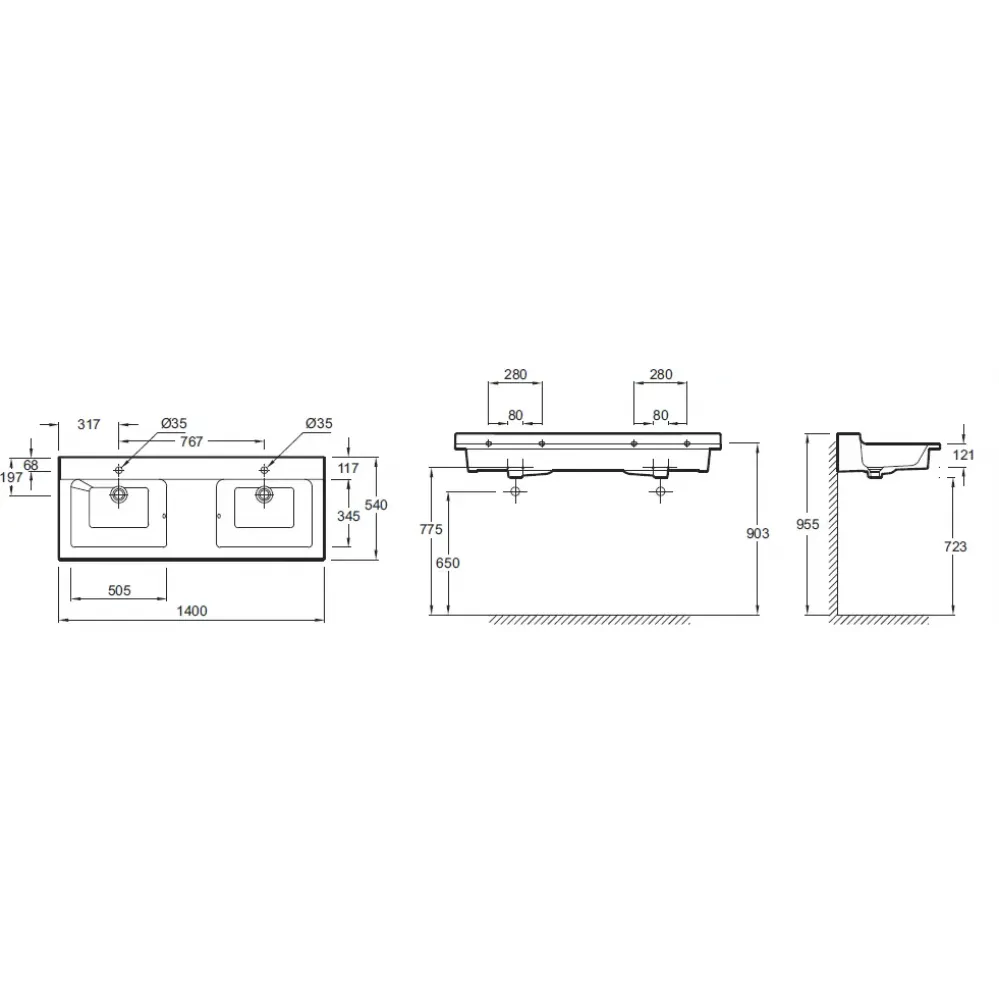 Двойная подвесная раковина-столешница 140 х 54 см.