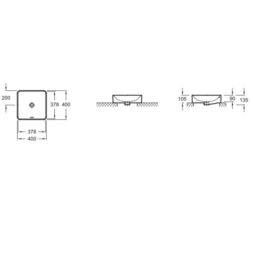 Технические характеристики Накладная раковина Vox 40х40х13,5 см, логотип 1930, с отверстием перелива в передней части, с заглушкой, санфарфор EVG102-PT6 Jacob Delafon