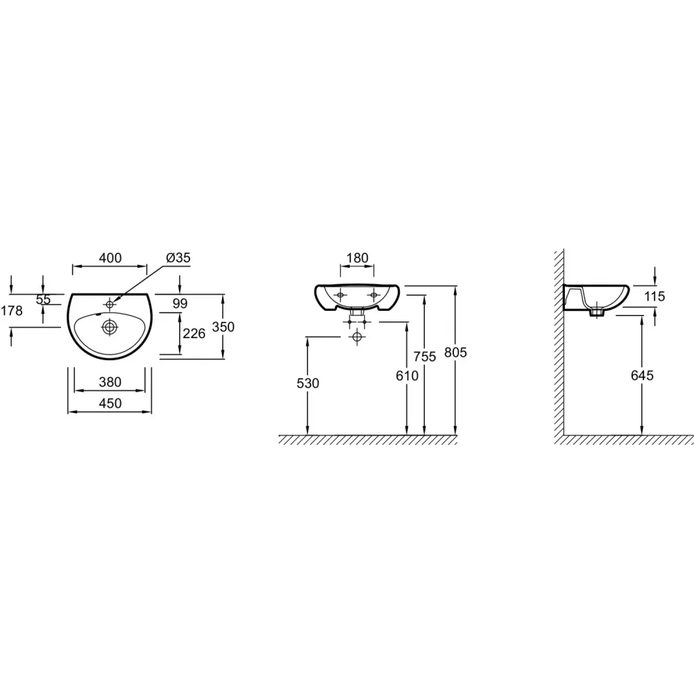 Технические характеристики Подвесная раковина Brive 45х35х11,5 см, санфарфор E4338-00 Jacob Delafon