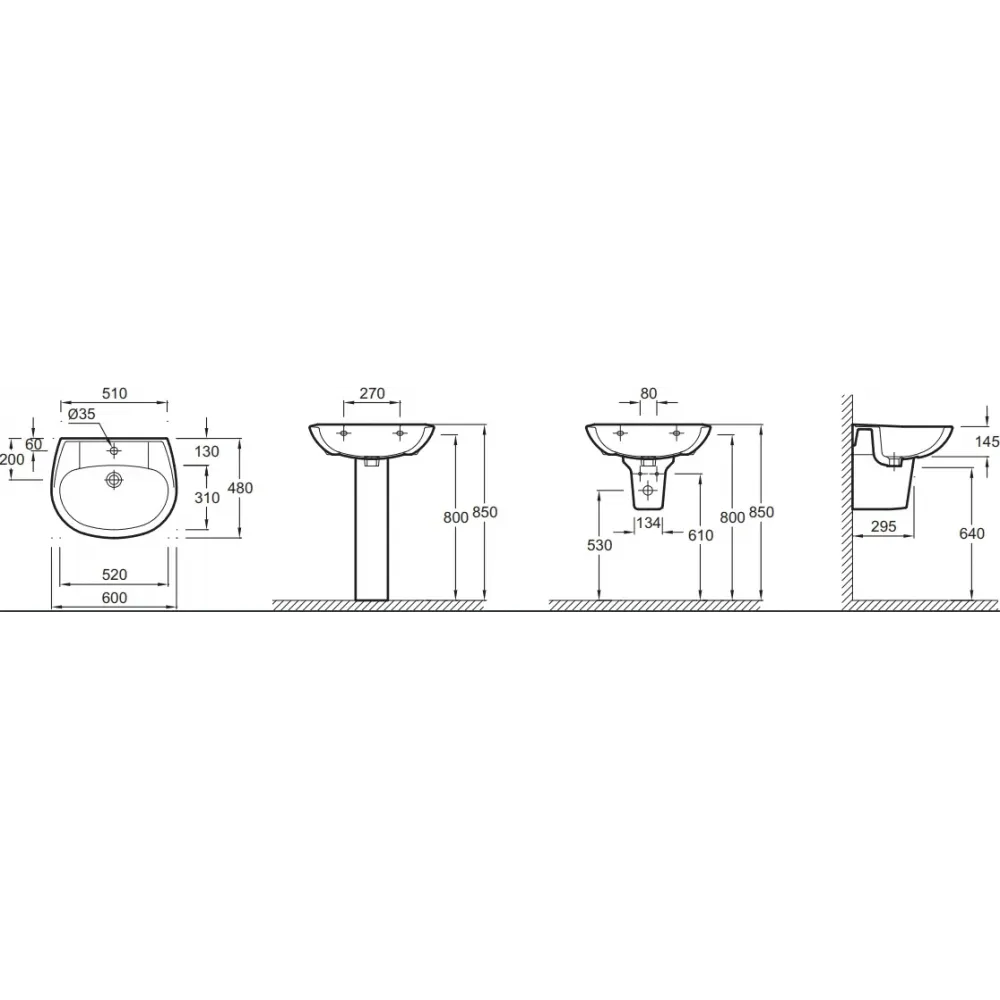 Технические характеристики Подвесная раковина Brive 60х48х14,5 см, без переливного отверстия, санфарфор, с отв. под смеситель E1288-00 Jacob Delafon