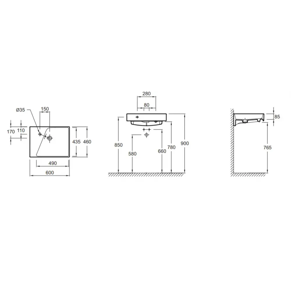 Технические характеристики Подвесная раковина Formilia Rythmik 60х46х8,5 см, с одним отверстием для смесителя слева, с переливом, санфарфор EXQ112-00 Jacob Delafon