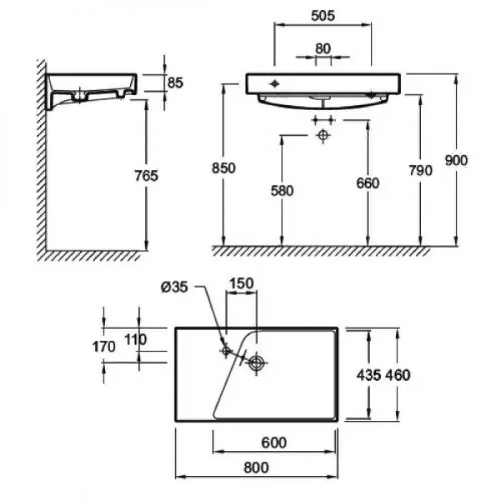 Технические характеристики Подвесная раковина Formilia Rythmik 80х46х8,5 см, одно отверстие под смеситель, гладкая нижняя поверхность, санфарфор EXO112-Z-00 Jacob Delafon