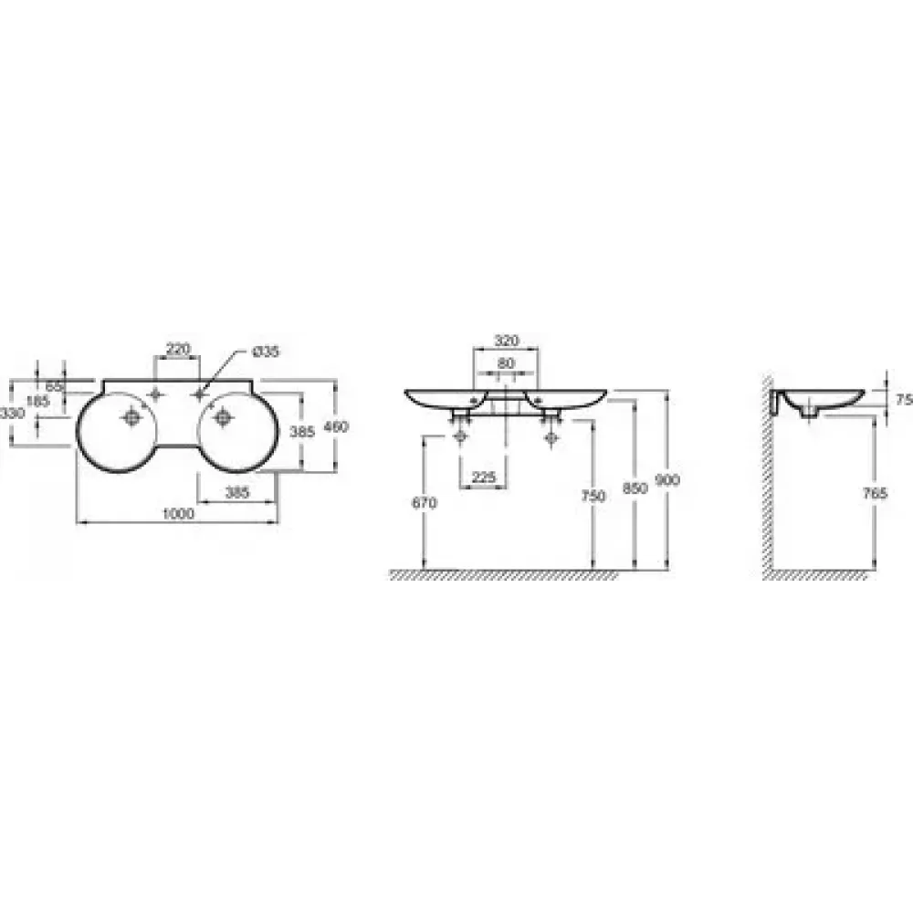 Технические характеристики Подвесная раковина Formilia Spherik 100х46х7,5 см, с 1 отверстием для каждого смесителя, санфарфор, двойная E4502-00 Jacob Delafon