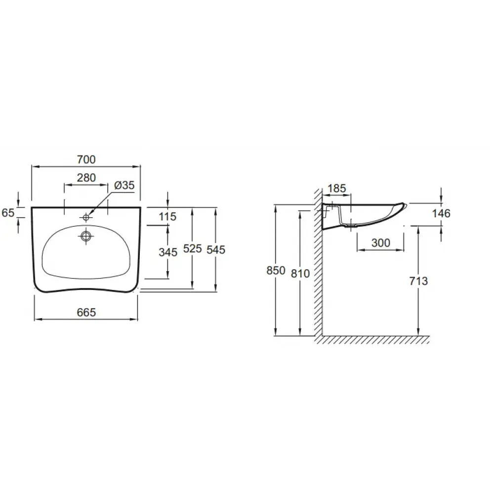 Подвесная раковина (70 х 54,5 см), одно отверстие для смесителя. Без