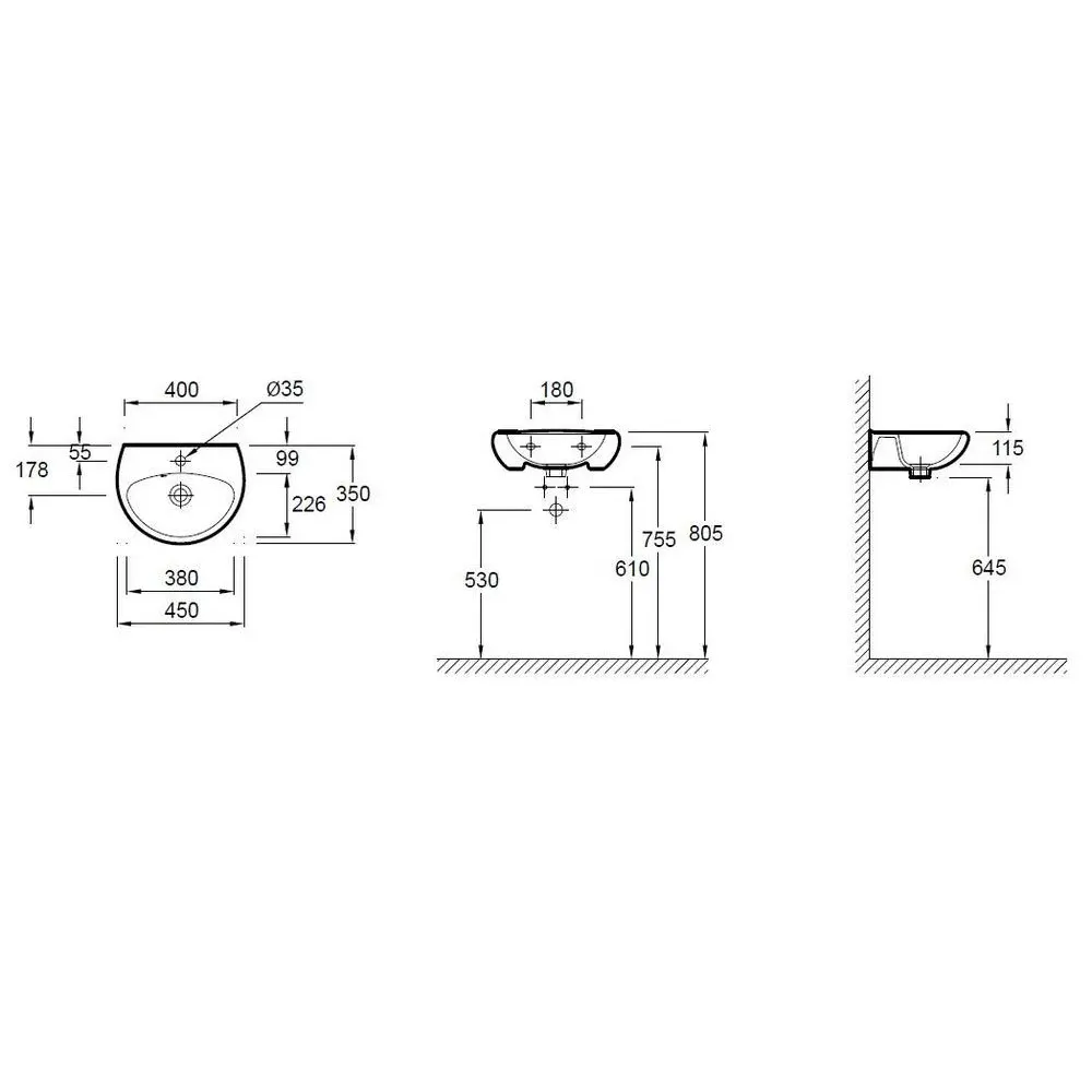 Технические характеристики Подвесная раковина Mideo 45х35х11,5 см, санфарфор E4338G-00 Jacob Delafon
