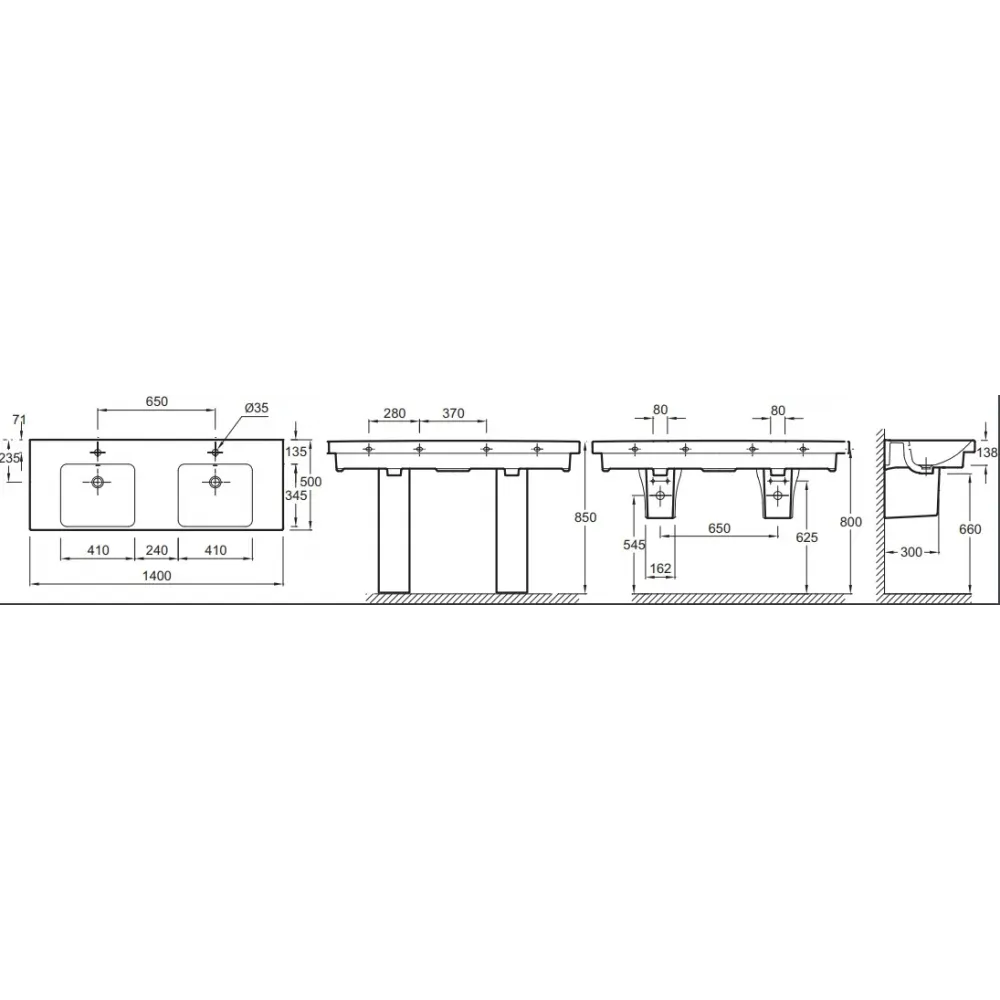 Технические характеристики Подвесная раковина Odeon Up 140х50х13,5 см, отверстия для смесителя справа и слева, санфарфор, двойная E4779-00 Jacob Delafon
