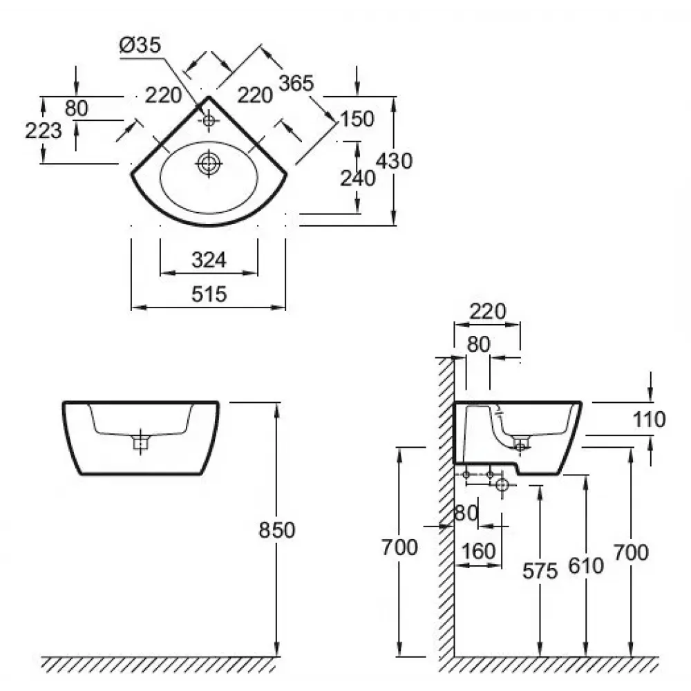Угловой рукомойник (36,5 x 36,5 см) с одним отверстием для смесителя