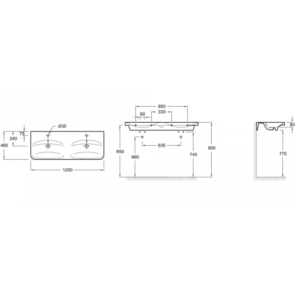 Технические характеристики Подвесная раковина Replay 120х46х8 см, с 1 отверстием для смесителя с каждой стороны, без переливного отверстия, санфарфор, двойная E4488-00 Jacob Delafon
