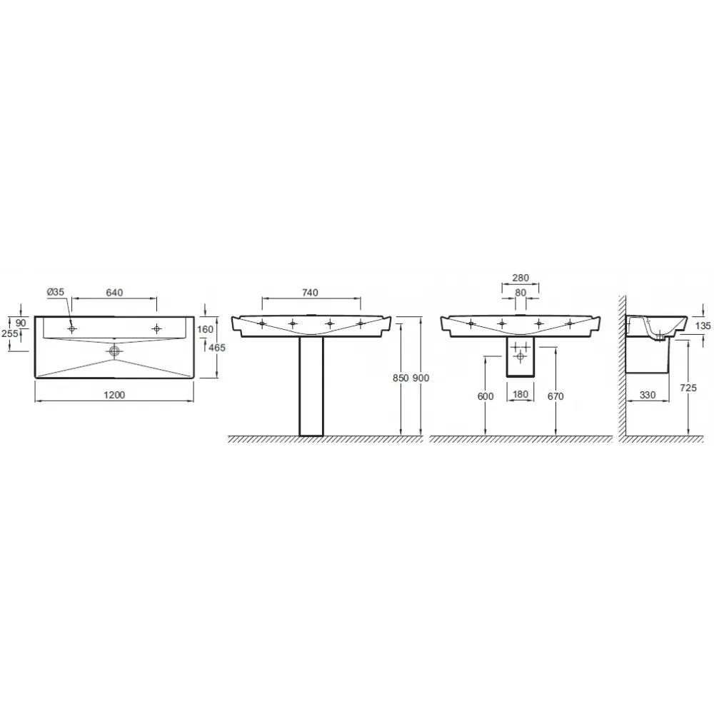 Технические характеристики Подвесная раковина Reve 120х46,5х13,5 см, с одним отверстием для смесителя слева и одним отверстием справа, санфарфор E4824-00 Jacob Delafon