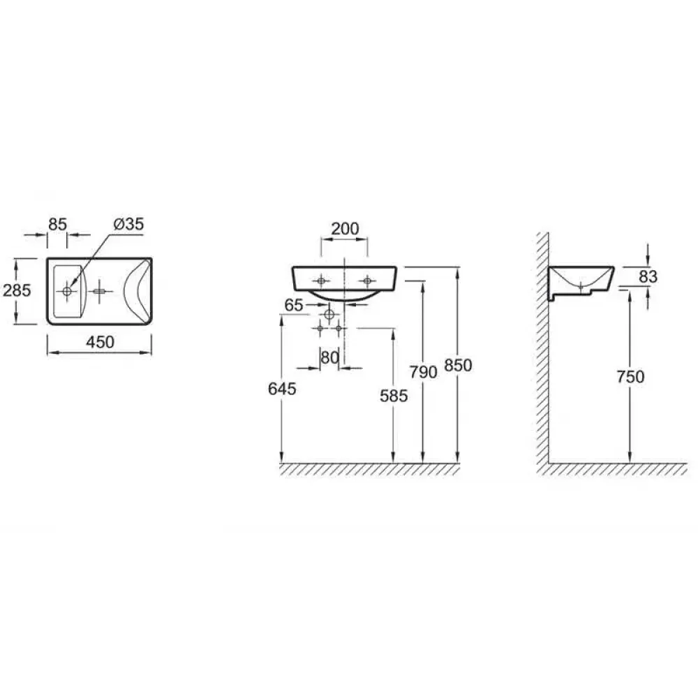 Технические характеристики Подвесная раковина Reve 45х28,5х8,3 см, одно отверстие для смесителя, без переливного отверстия, санфарфор E4805-00 Jacob Delafon